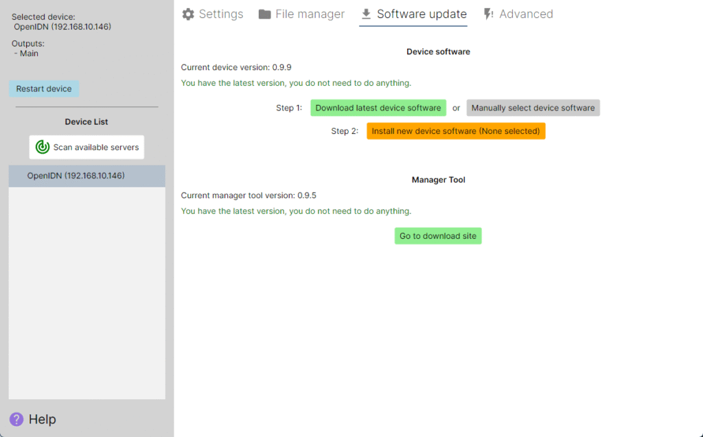 In the main section on the right side, there are multiple tabs in a menu at the top for performing different management tasks on the selected device. The Settings tab lets you modify the settings of a device, either online or offline. The File Manager tab lets you browse, upload and change playback parameters of .ILD files on the device. These files can be played by the onboard file player. The Software Update tab lets you upgrade to a newer version of the software on the device, as well as the Manager Tool itself. It is recommended to check for new versions regularly for new features and bug fixes. The Advanced tab contains more technical operations that most users will never require.